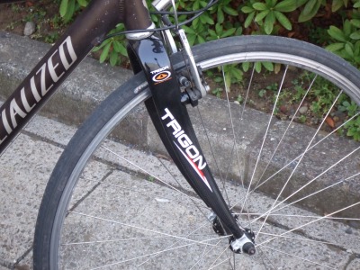 クロスライダーのサスペンションがうんともすんとも全く動かなくなったので、思い切ってリジットのカーボンフォークへ差し替えました。 TRIGONのシクロクロス用フォーク。めちゃくちゃ軽くなり、ハンドリングもクイックになりました。 唯一の欠点は、サス着きが前提のフレームなので、ボトムブラケットの位置も下がり、漕ぎながら車体を傾けると地面にペダルが簡単に接触することです。 PR