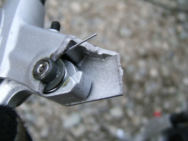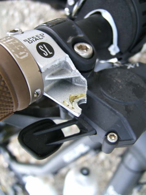 道を下っていてバイクを木にぶつけてしまい、ブレーキレバーの取り付け部がぱっくり折れてしまいました。正確には、ぶつけたあとにレバーのタッチがフカフカなのでブレーキをよく見てみると亀裂が入っており、引張ると取れました。 ハンドルバーへの取り付けを、衝撃があったらレバーが回転してずれる位の固定をしていればよかったのでしょうが、どのぐらい締めておけば普段は緩まず、いざという時のみずれるのかよくわからないので、きつめに固定していたのが原因なようです。 ブレーキは無いと困るので、帰りがけにショップにニューXTを注文しました。えへ。 ↓折れたavid speed dial SL。結構高かったのに・・ 人気blogランキングへ にほんブログ村 写真ブログへ