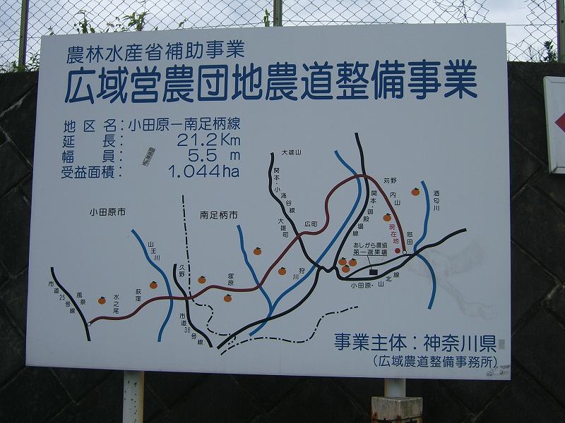 酒匂川サイクリングロードの終点近くから、足柄広域農道がはじまる。 道はアップダウンしながら、みかん畑を行く。 時々、猛烈な勢いのバイクに抜かれたりすれ違ったりする以外はあまり車と出会わない。 →左下の写真の標識の場所←